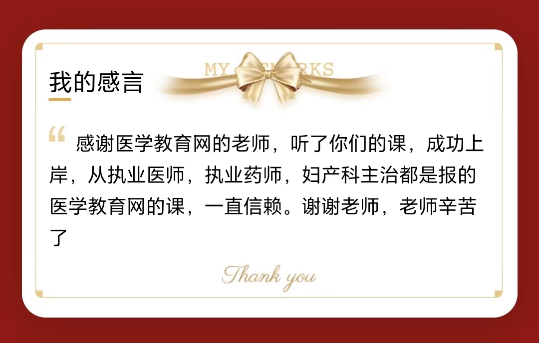 感謝醫(yī)學(xué)教育網(wǎng)的老師,聽了你們的課,成功上岸,從執(zhí)業(yè)醫(yī)師,執(zhí)業(yè)藥師,婦產(chǎn)科主治都是報(bào)的醫(yī)學(xué)教育網(wǎng)的課,一直信賴。謝謝老師,老師辛苦!