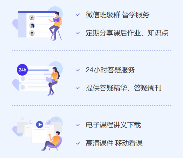 班級群督學、多樣答疑服務、高清視頻課件、電子講義、移動看課等多元化教學服務,助你備考加速!