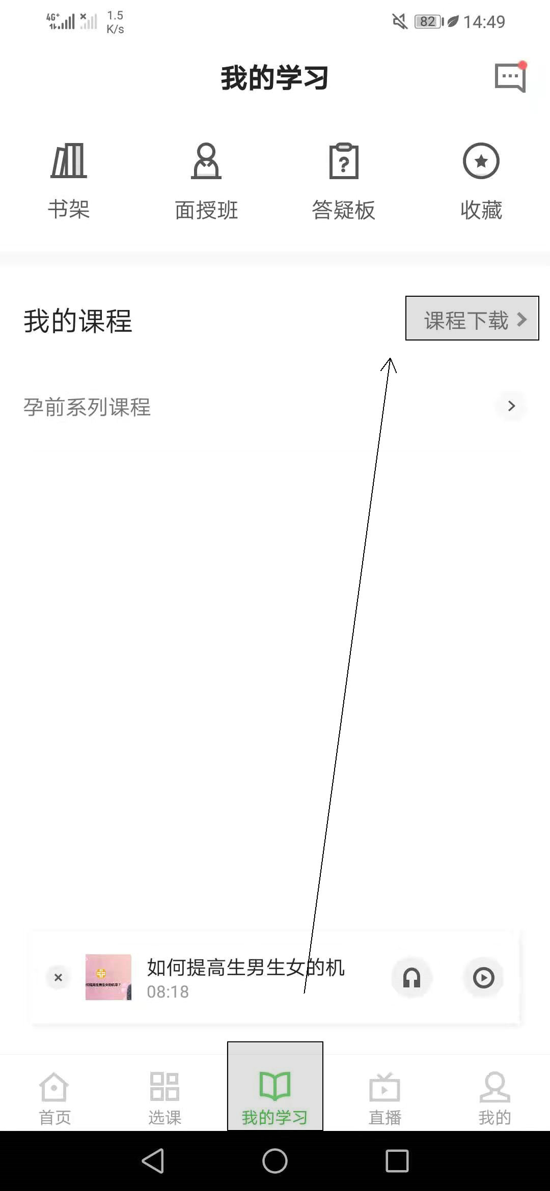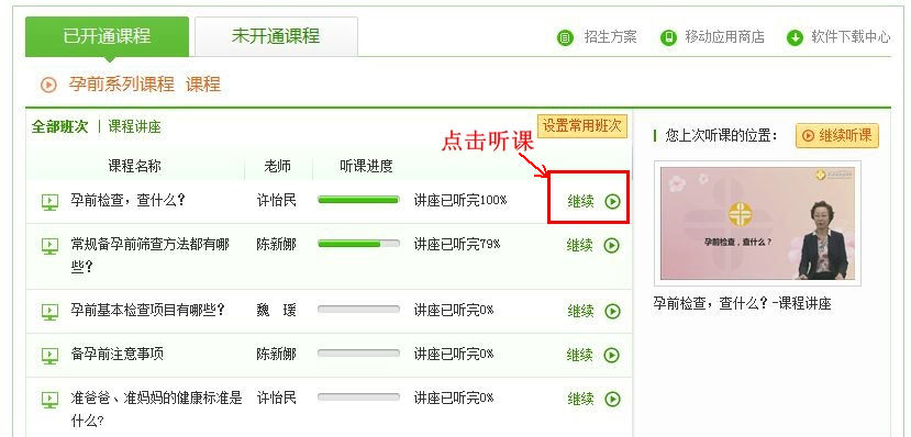 第三步:進(jìn)入我的網(wǎng)校我的家后,您所購(gòu)買的課程將依次列在“我的課程”下方,點(diǎn)擊“孕前系列課程”,進(jìn)入。