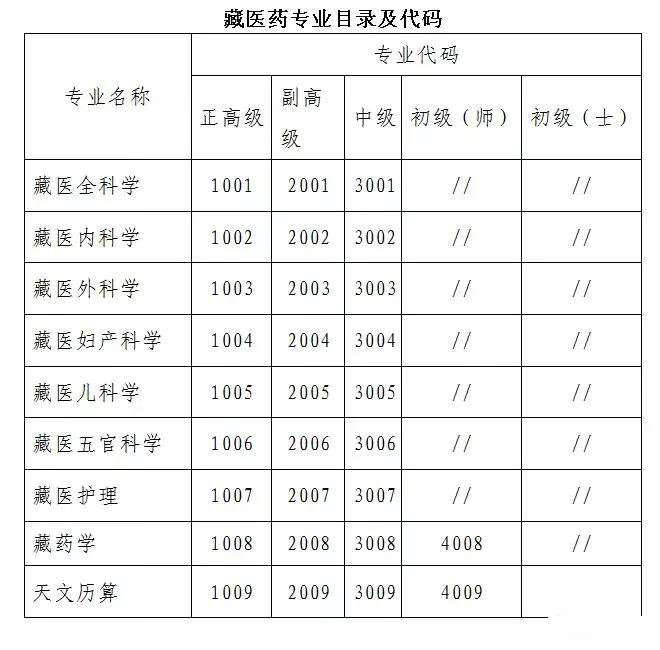 考試科目分西醫(yī)(含中醫(yī))和藏醫(yī)(含藏藥、藏醫(yī)護理、天文歷算)兩個科目。其中西醫(yī)分正高、副高兩個級別;藏醫(yī)和藏醫(yī)護理分正高、副高、中級三個級別;藏藥、天文歷算分正高、副高、中級、初級(師)四個級別。(專業(yè)目錄見下文)