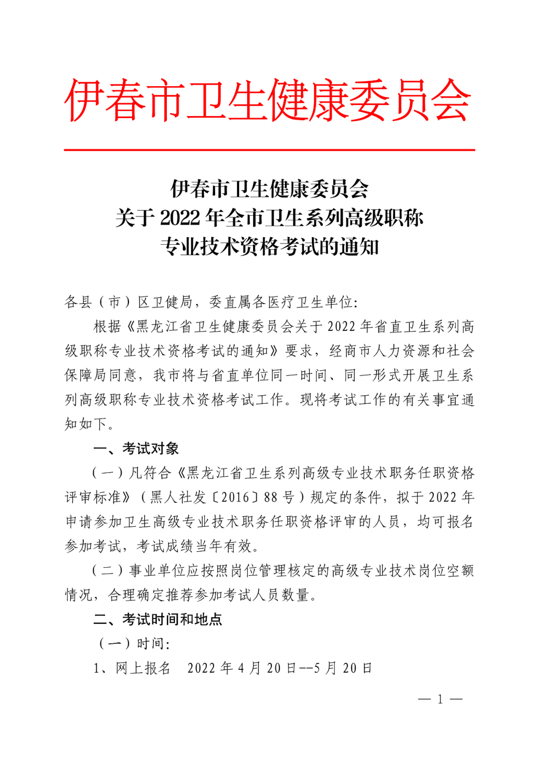 健康伊春發(fā)布關(guān)于2022年全市衛(wèi)生系列高級(jí)職稱專業(yè)技術(shù)考試的通知,醫(yī)學(xué)教育網(wǎng)整理具體內(nèi)容如下: