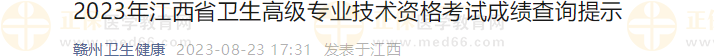贛州衛(wèi)生健康發(fā)布2023年江西省衛(wèi)生高級(jí)專業(yè)技術(shù)資格考試成績(jī)查詢提示,醫(yī)學(xué)教育網(wǎng)整理具體內(nèi)容如下: