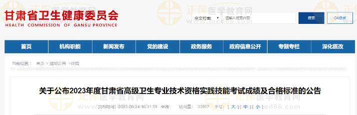 甘肅省衛(wèi)生健康委員會發(fā)布關(guān)于公布2023年度甘肅省高級衛(wèi)生專業(yè)技術(shù)資格實踐技能考試成績及合格標(biāo)準(zhǔn)的公告,醫(yī)學(xué)教育網(wǎng)整理具體內(nèi)容如下: