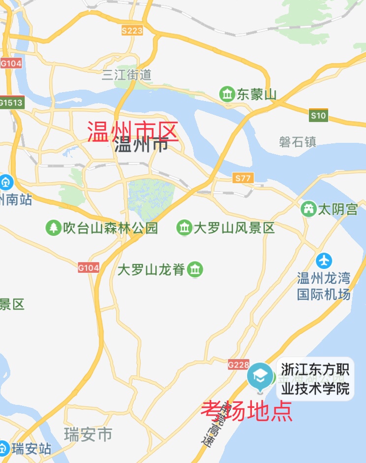 特別提醒:本次考場設在浙江東方職業(yè)技術學院,地點:溫州市經濟技術開發(fā)區(qū)金海三道433號,見下圖。請考生提前查看并規(guī)劃好出行路線,赴考時應提前預留足夠的時間,以免出現去錯考場、遲到等情況。