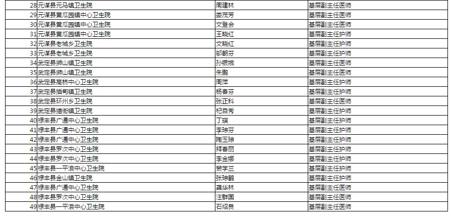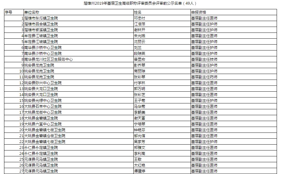 根據(jù)《云南省人力資源和社會保障廳關于印發(fā)2019年高級專業(yè)技術職稱評審計劃的通知》(云人社通〔2019〕47號)要求,楚雄州2019年基層衛(wèi)生高級職稱評審會將于9月召開。經(jīng)對申報人員范圍對象、程序手續(xù)、申報評審條件進行資格審查,現(xiàn)將擬同意提交評委會評審的49名參評人員予以公示(公示期為2019年8月29日—9月4日)。在公示期內(nèi)對申報人不符合資格條件或弄虛作假的情況,可向楚雄州衛(wèi)生健康委人事科或州紀委監(jiān)委派駐州衛(wèi)生健康委紀檢監(jiān)察組反映。