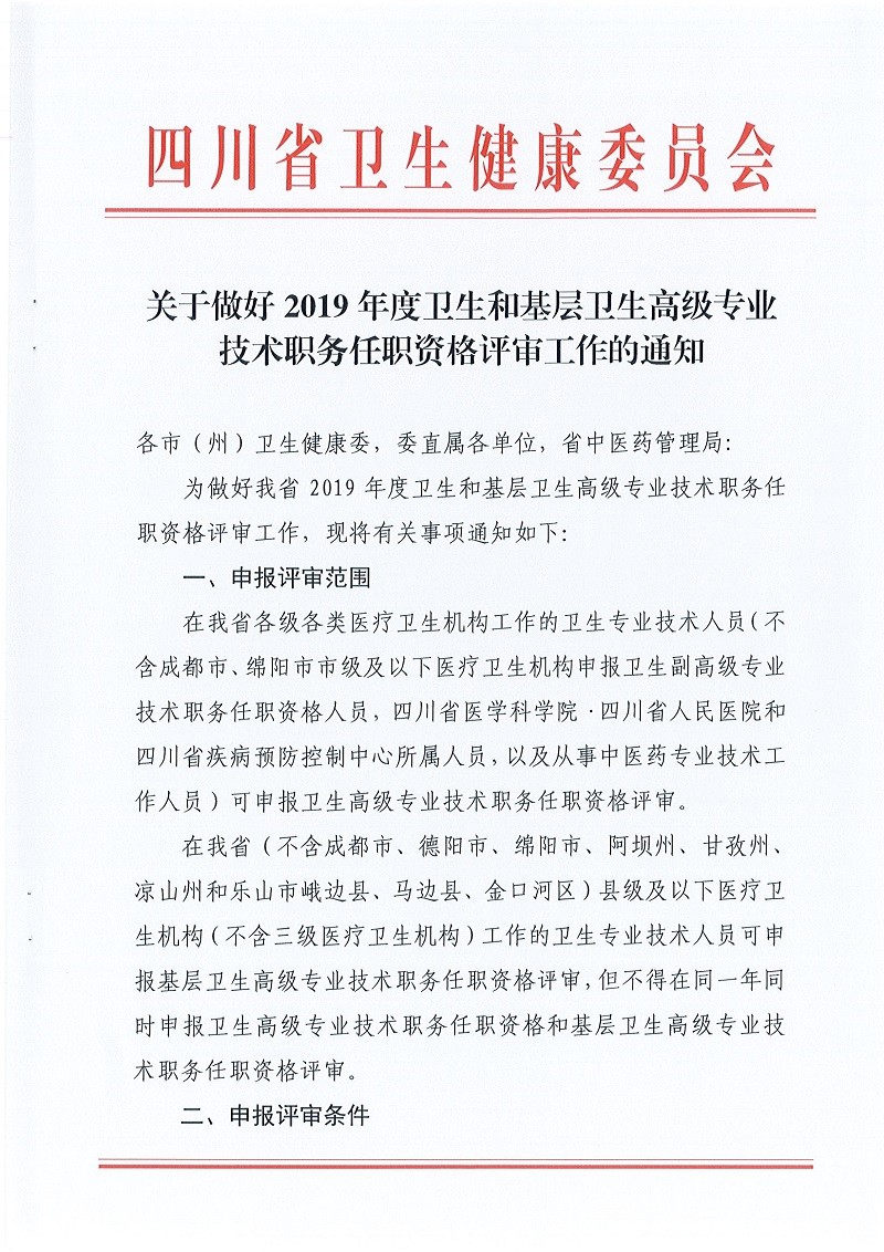 四川省關(guān)于做好2019年度衛(wèi)生和基層衛(wèi)生高級(jí)專(zhuān)業(yè)技術(shù)職務(wù)任職資格評(píng)審工作的通知公布,醫(yī)學(xué)教育網(wǎng)為大家整理如下: