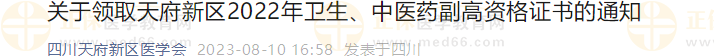 四川天府新區(qū)醫(yī)學(xué)會發(fā)布關(guān)于領(lǐng)取天府新區(qū)2022年衛(wèi)生、中醫(yī)藥副高資格證書的通知,醫(yī)學(xué)教育網(wǎng)整理具體內(nèi)容如下: