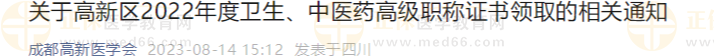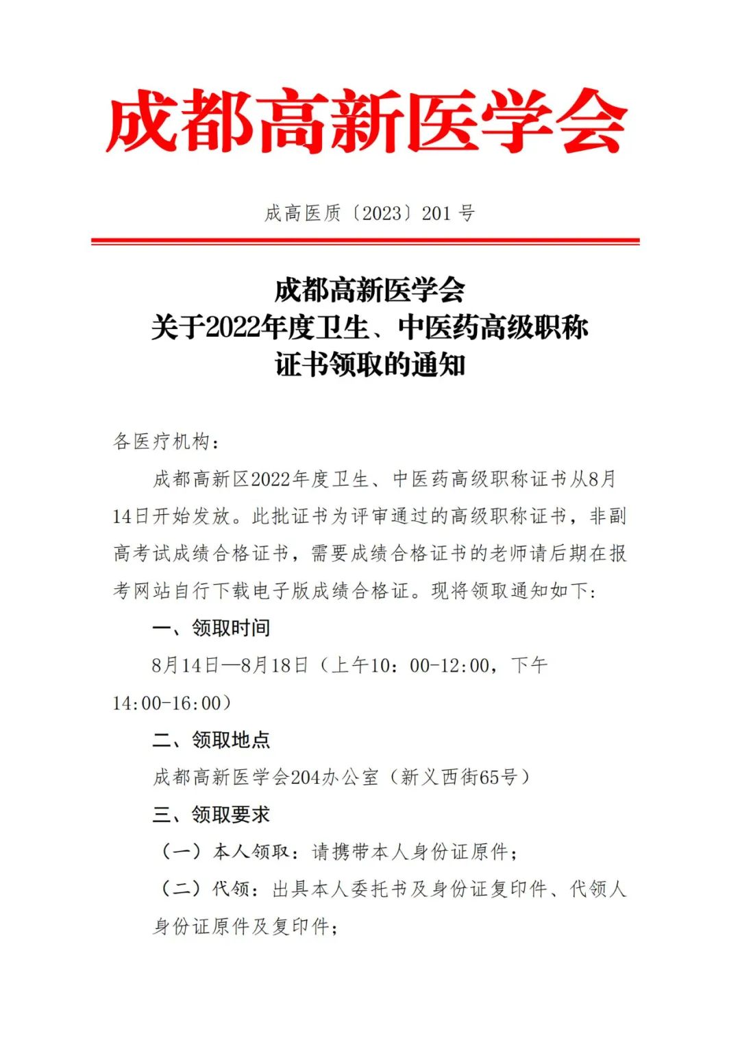 成都高新醫(yī)學(xué)會(huì)發(fā)布關(guān)于高新區(qū)2022年度衛(wèi)生、中醫(yī)藥高級(jí)職稱證書領(lǐng)取的相關(guān)通知,醫(yī)學(xué)教育網(wǎng)整理具體內(nèi)容如下: