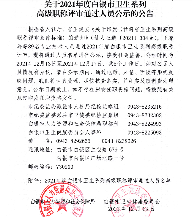白銀市人力資源和社會保障局發(fā)布關(guān)于2021年度白銀市衛(wèi)生系列高級職稱評審?fù)ㄟ^人員公示的公告,醫(yī)學教育網(wǎng)整理具體內(nèi)容如下: