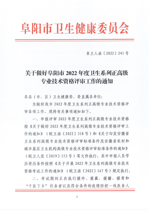 關(guān)于做好阜陽市2022年度衛(wèi)生系列正高級專業(yè)技術(shù)資格評審工作的通知