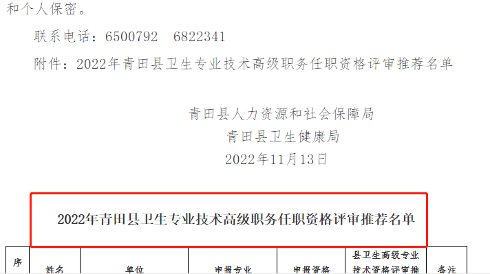 根據(jù)《麗水市衛(wèi)生健康委 麗水市人力社保局關(guān)于做好2022年度全市衛(wèi)生高級職稱評聘工作的通知》(麗衛(wèi)〔2022〕131號)等文件規(guī)定,青田縣人力社保局、青田縣衛(wèi)生健康局積極開展衛(wèi)生高級專業(yè)技術(shù)資格申報評審工作。共計收到單位推薦的申報人材料6份,其中申報正高級專業(yè)技術(shù)職務(wù)2份、申報副高級專業(yè)技術(shù)職務(wù)4份。經(jīng)青田縣衛(wèi)生高級專業(yè)技術(shù)資格評審?fù)扑]委員會評審,決定推薦申報人6名,其中正高級專業(yè)技術(shù)職務(wù)資格申報人2名,副高級專業(yè)技術(shù)職務(wù)資格申報人4名。現(xiàn)將推薦名單予以公示(排名不分先后),公示期從2022年11月13日至2022年11月19日止。