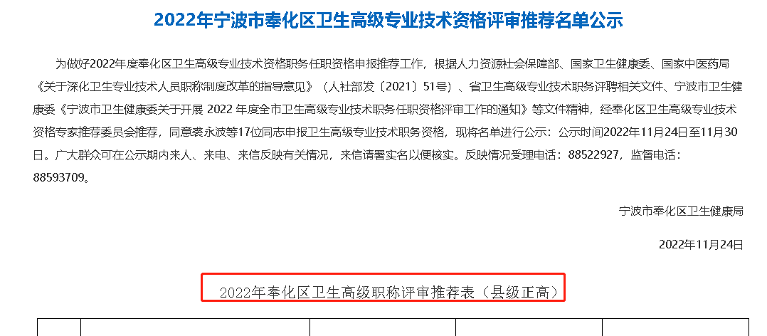 為做好2022年度奉化區(qū)衛(wèi)生高級專業(yè)技術(shù)資格職務(wù)任職資格申報推薦工作,根據(jù)人力資源社會保障部、國家衛(wèi)生健康委、國家中醫(yī)藥局《關(guān)于深化衛(wèi)生專業(yè)技術(shù)人員職稱制度改革的指導(dǎo)意見》(人社部發(fā)〔2021〕51號)、省衛(wèi)生高級專業(yè)技術(shù)職務(wù)評聘相關(guān)文件、寧波市衛(wèi)生健康委《寧波市衛(wèi)生健康委關(guān)于開展 2022 年度全市衛(wèi)生高級專業(yè)技術(shù)職務(wù)任職資格評審工作的通知》等文件精神,經(jīng)奉化區(qū)衛(wèi)生高級專業(yè)技術(shù)資格專家推薦委員會推薦,同意裘永波等17位同志申報衛(wèi)生高級專業(yè)技術(shù)職務(wù)資格,現(xiàn)將名單進行公示:公示時間2022年11月24日至11月30日。廣大群眾可在公示期內(nèi)來人、來電、來信反映有關(guān)情況,來信請署實名以便核實。反映情況受理電話:88522927,監(jiān)督電話:88593709。