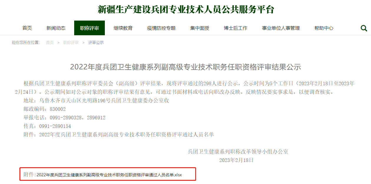 新疆生產(chǎn)建設(shè)兵團專業(yè)技術(shù)人員公共服務(wù)平臺發(fā)布2022年度兵團衛(wèi)生健康系列副高級專業(yè)技術(shù)職務(wù)任職資格評審結(jié)果公示,醫(yī)學教育網(wǎng)整理具體內(nèi)容如下: