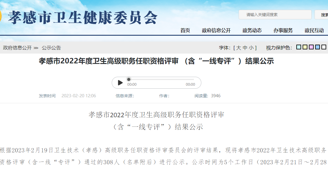 孝感市衛(wèi)生健康委員會發(fā)布孝感市2022年度衛(wèi)生高級職務(wù)任職資格評審 (含“一線專評”)結(jié)果公示,醫(yī)學(xué)教育網(wǎng)整理具體內(nèi)容如下: