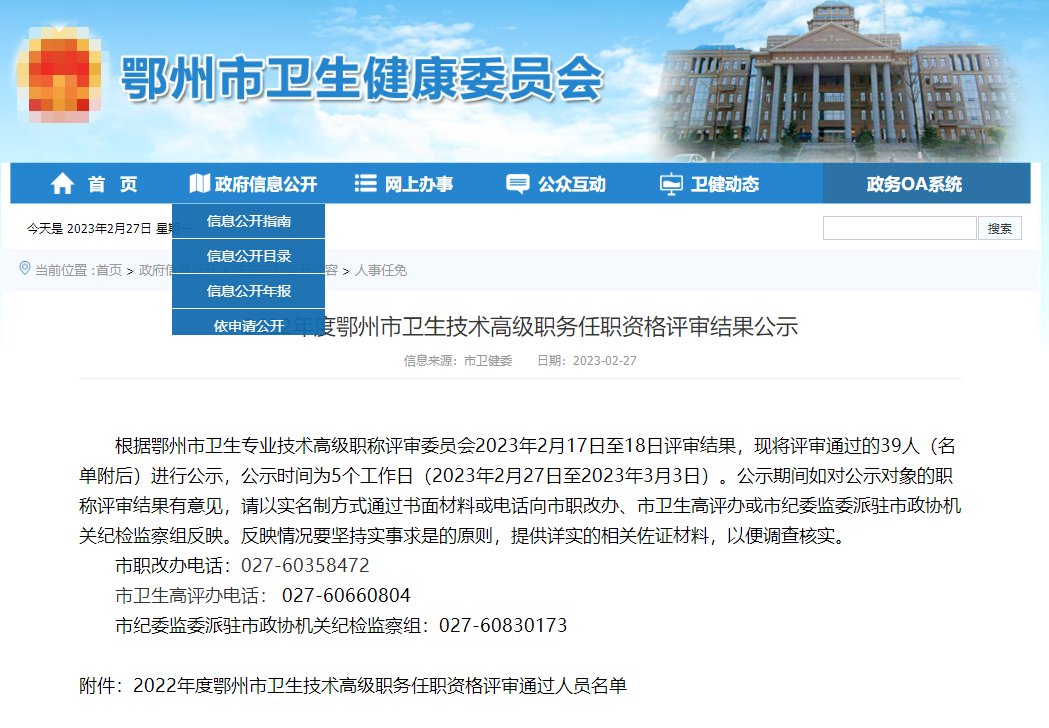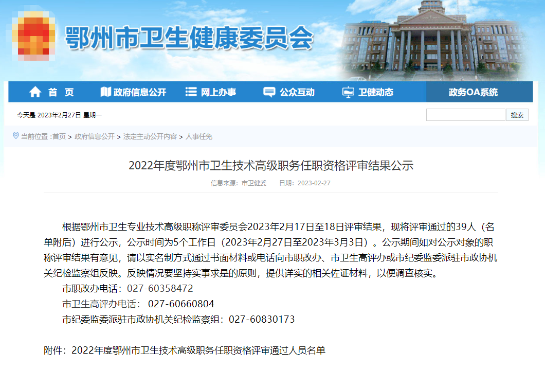 根據(jù)鄂州市衛(wèi)生專業(yè)技術(shù)高級職稱評審委員會2023年2月17日至18日評審結(jié)果,現(xiàn)將評審?fù)ㄟ^的39人(名單附后)進行公示,公示時間為5個工作日(2023年2月27日至2023年3月3日)。公示期間如對公示對象的職稱評審結(jié)果有意見,請以實名制方式通過書面材料或電話向市職改辦、市衛(wèi)生高評辦或市紀(jì)委監(jiān)委派駐市政協(xié)機關(guān)紀(jì)檢監(jiān)察組反映。反映情況要堅持實事求是的原則,提供詳實的相關(guān)佐證材料,以便調(diào)查核實。