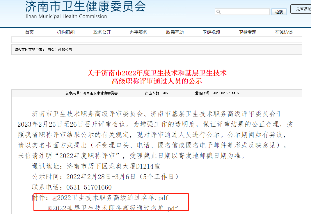 濟南市衛(wèi)生技術(shù)職務(wù)高級評審委員會、濟南市基層衛(wèi)生技術(shù)職務(wù)高級評審委員會于2023年2月25日至26日召開評審會議。為增強工作的透明度,保證評審結(jié)果的公正合理,按照我省職稱評審結(jié)果公示的有關(guān)規(guī)定,現(xiàn)對評審通過人員進行公示。公示期間如有異議,請以實名書面方式提出(不受理口頭、電話、匿名信或匿名電子郵件等形式反映意見)。來信請注明“2022年度職稱評審”,受理截止日期以寄發(fā)地郵戳日期為準。
