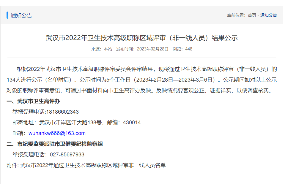 根據(jù)2022年武漢市衛(wèi)生技術(shù)高級(jí)職稱評(píng)審委員會(huì)評(píng)審結(jié)果,現(xiàn)將通過(guò)衛(wèi)生技術(shù)高級(jí)職稱評(píng)審(非一線人員)的134人進(jìn)行公示(名單附后)。公示時(shí)間為5個(gè)工作日(2023年2月28日—2023年3月6日)。公示期間如對(duì)以上公示對(duì)象的職稱評(píng)審有意見(jiàn),可通過(guò)書(shū)面材料向市衛(wèi)生高評(píng)辦反映。反映情況要客觀公正、證據(jù)詳實(shí),以便調(diào)查核實(shí)。