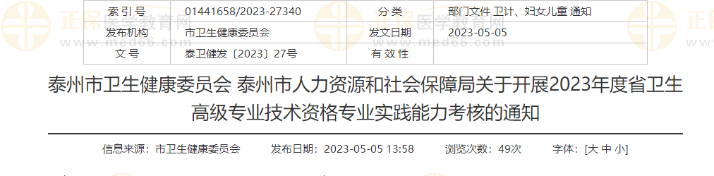 泰州市衛(wèi)生健康委員會泰州市人力資源和社會保障局關(guān)于開展2023年度省衛(wèi)生高級專業(yè)技術(shù)資格專業(yè)實踐能力考核的通知公布啦!醫(yī)學(xué)教育網(wǎng)整理具體內(nèi)容如下: