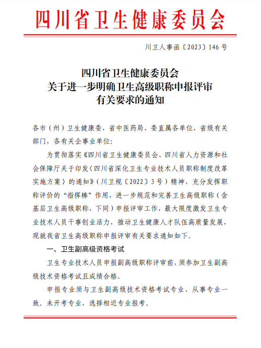 四川省衛(wèi)生健康委員會(huì)關(guān)于進(jìn)一步明確衛(wèi)生高級職稱申報(bào)評審有關(guān)要求的通知公布啦!醫(yī)學(xué)教育網(wǎng)整理具體內(nèi)容如下: