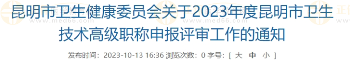 昆明市衛(wèi)生健康委員會(huì)關(guān)于2023年度昆明市衛(wèi)生技術(shù)高級(jí)職稱申報(bào)評(píng)審工作的通知公布啦!醫(yī)學(xué)教育網(wǎng)整理具體內(nèi)容如下: