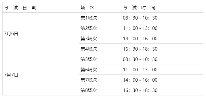 考試采用人機(jī)對(duì)話考試的方式進(jìn)行,分8個(gè)場(chǎng)次,每場(chǎng)次120分鐘;考試場(chǎng)次及時(shí)間安排如下: