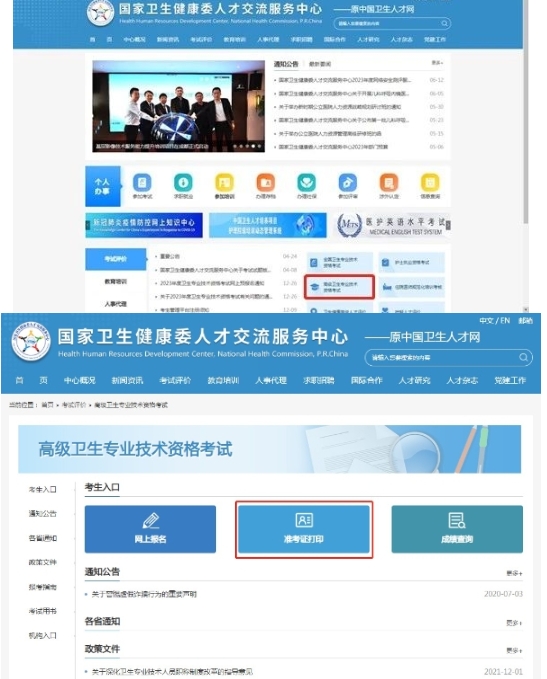第一步:登錄國(guó)家衛(wèi)生健康委人才交流服務(wù)中心網(wǎng)站,進(jìn)入高級(jí)衛(wèi)生專業(yè)技術(shù)資格考試專區(qū),點(diǎn)擊“準(zhǔn)考證打印”。