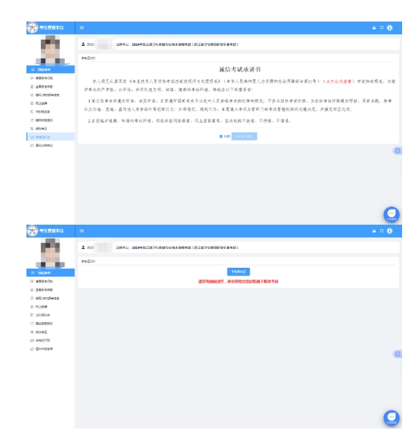 第三步:登錄成功后,依次點(diǎn)擊左邊菜單欄“進(jìn)入網(wǎng)上報(bào)名”——2024年浙江省衛(wèi)生高級(jí)專業(yè)技術(shù)資格考試(浙江省衛(wèi)生管理研究專業(yè)考試)”,點(diǎn)擊“選擇”進(jìn)入,在系統(tǒng)頁(yè)面菜單欄點(diǎn)擊“準(zhǔn)考證打印”,閱讀“誠(chéng)信考試承諾書”,勾選“同意”后點(diǎn)擊“下一步”下載準(zhǔn)考證即可。請(qǐng)?jiān)陔娔X端操作,建議使用谷歌瀏覽器下載準(zhǔn)考證。