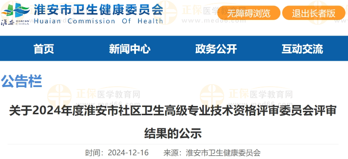 關(guān)于2024年度淮安市社區(qū)衛(wèi)生高級專業(yè)技術(shù)資格評審委員會評審結(jié)果的公示?公布啦!醫(yī)學教育網(wǎng)整理具體內(nèi)容如下: