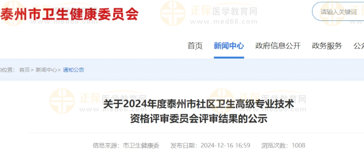 關(guān)于2024年度泰州市社區(qū)衛(wèi)生高級專業(yè)技術(shù)資格評審委員會評審結(jié)果的公示公布啦!醫(yī)學(xué)教育網(wǎng)整理具體內(nèi)容如下: