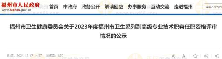 福州市衛(wèi)生健康委員會(huì)關(guān)于2023年度福州市衛(wèi)生系列副高級專業(yè)技術(shù)職務(wù)任職資格評審情況的公示公布啦!醫(yī)學(xué)教育網(wǎng)整理具體內(nèi)容如下: