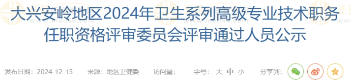 大興安嶺地區(qū)2024年衛(wèi)生系列高級專業(yè)技術(shù)職務(wù)任職資格評審委員會評審?fù)ㄟ^人員公示公布啦!醫(yī)學(xué)教育網(wǎng)整理具體內(nèi)容如下: