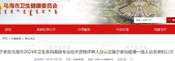 關(guān)于參加烏海市2024年衛(wèi)生系列高級專業(yè)技術(shù)資格評審人員認(rèn)定屬于參加疫情一線人員名單的公示公布啦!醫(yī)學(xué)教育網(wǎng)整理具體內(nèi)容如下: