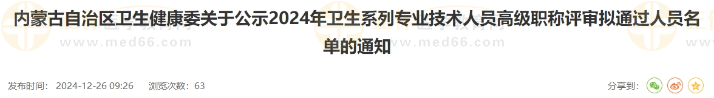 內蒙古自治區(qū)衛(wèi)生健康委關于公示2024年衛(wèi)生系列專業(yè)技術人員高級職稱評審擬通過人員名單的通知公布啦!醫(yī)學教育網整理具體內容如下:
