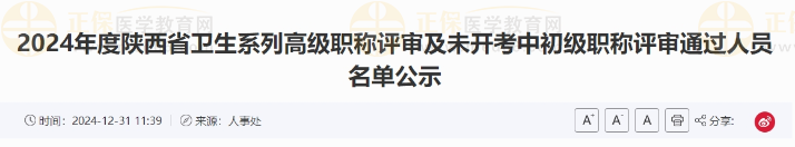2024年度陜西省衛(wèi)生系列高級(jí)職稱評(píng)審及未開考中初級(jí)職稱評(píng)審?fù)ㄟ^人員名單公示公布啦!醫(yī)學(xué)教育網(wǎng)整理具體內(nèi)容如下: