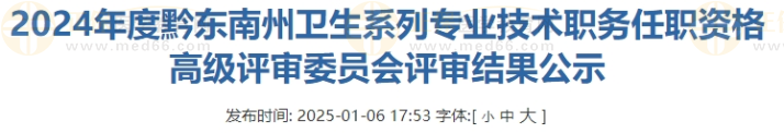 2024年度黔東南州衛(wèi)生系列專業(yè)技術(shù)職務(wù)任職資格高級(jí)評(píng)審委員會(huì)評(píng)審結(jié)果公示公布啦!醫(yī)學(xué)教育網(wǎng)整理具體內(nèi)容如下: