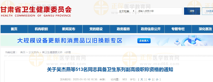 甘肅省關(guān)于吳杰燕等513名同志具備衛(wèi)生系列副高級(jí)職稱資格的通知公布啦!醫(yī)學(xué)教育網(wǎng)整理具體內(nèi)容如下: