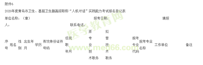 青島市2020年衛(wèi)生、基層衛(wèi)生副高級(jí)職稱“人機(jī)對(duì)話”實(shí)踐能力考試報(bào)名登記表,為幫助各位考生及時(shí)了解詳情,醫(yī)學(xué)教育網(wǎng)小編整理官方內(nèi)容如下: