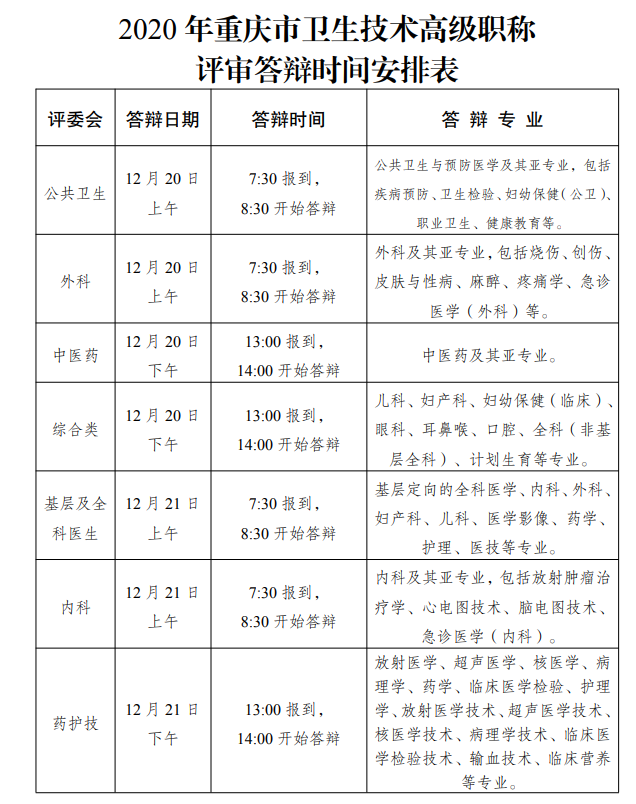 技術(shù)高級衛(wèi)生職稱考過需要答辯嗎?是需要的。按照《重慶市衛(wèi)生健康委員會職稱改革辦公室關(guān)于開展2020年全市衛(wèi)生技術(shù)高級職稱評審答辯工作的通知》(渝衛(wèi)職辦〔2020〕49號)精神,2020年全市衛(wèi)生技術(shù)高級職稱評審各專業(yè)正高答辯時間為12月20—21日。因工作需要,現(xiàn)對答辯時間進行適當(dāng)調(diào)整,每天分為上午場和下午場,具體安排見附件。