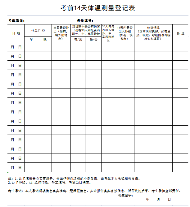5.考試當(dāng)天,進(jìn)入考點(diǎn)時應(yīng)現(xiàn)場出示考試日前7天內(nèi)核酸檢測陰性證明(或我市考試期間具體規(guī)定)、“遼事通健康碼”、《考前14天體溫登記表》,并主動配合工作人員接受體溫檢測,體溫檢測確認(rèn)正常的(低于37.3℃)方可進(jìn)入考點(diǎn)參加考試,如發(fā)現(xiàn)體溫異常(≥37.3℃),需現(xiàn)場進(jìn)行體溫復(fù)測。
