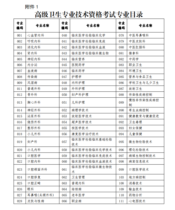 1.高級(jí)衛(wèi)生專業(yè)技術(shù)資格考試專業(yè)目錄