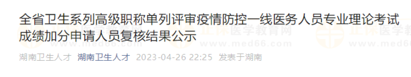 根據(jù)湖南省衛(wèi)生系列高級(jí)職稱(chēng)單列評(píng)審工作安排,我辦對(duì)提交了《疫情防控一線醫(yī)務(wù)人員專(zhuān)業(yè)理論考試成績(jī)加分申請(qǐng)表》的參評(píng)人員進(jìn)行了復(fù)核,現(xiàn)將申請(qǐng)人員名單復(fù)核情況在湖南衛(wèi)生人才網(wǎng)()進(jìn)行公示,公示期為2023年4月27日至5月6日。如公示情況與實(shí)際情況不一致的,請(qǐng)補(bǔ)充相關(guān)表格或證明材料。補(bǔ)交材料時(shí)間為4月27日至5月6日17:00,逾期不再補(bǔ)交。