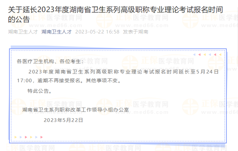 2023年度湖南省衛(wèi)生系列高級職稱專業(yè)理論考試報名時間延長至5月24日17:00,逾期不再接受報名。其他事項不變。