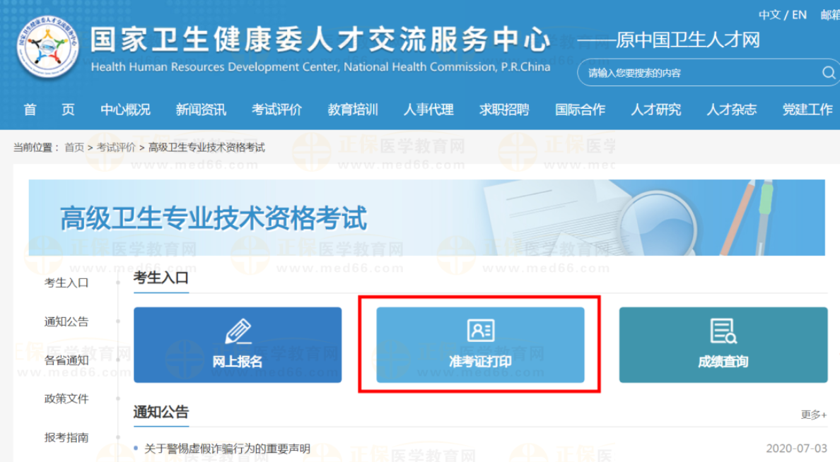 登錄國家衛(wèi)生健康委人才交流中心()網(wǎng)站,進入“高級衛(wèi)生專業(yè)技術(shù)資格考試”欄目,點擊“準(zhǔn)考證打印”。