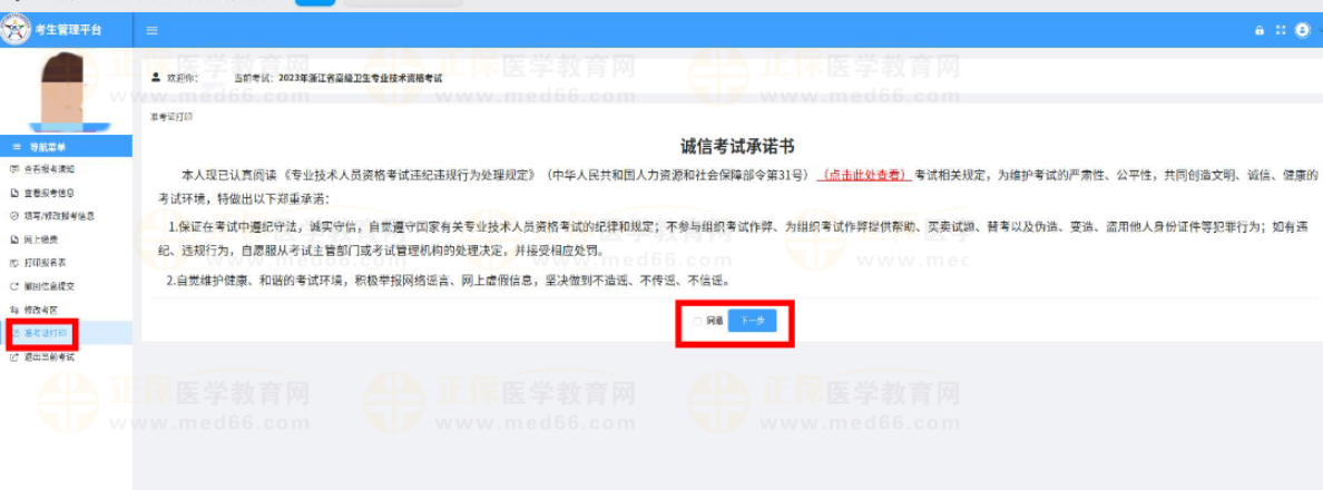 在準(zhǔn)考證打印窗口“考生管理平臺”輸入正確的用戶名和密碼,選擇2023年浙江省高級衛(wèi)生專業(yè)技術(shù)資格考試,認(rèn)真閱讀《誠信考試承諾書》,打印、下載準(zhǔn)考證,并妥善保管。