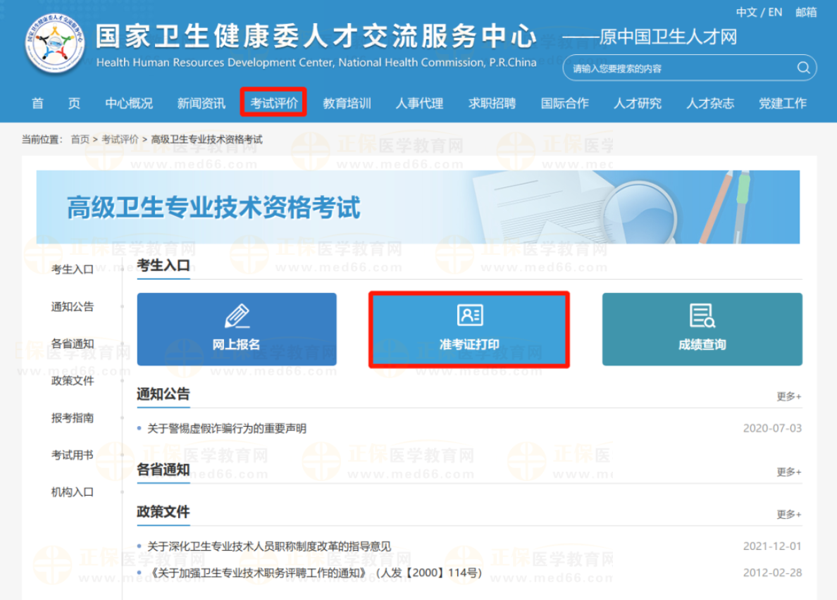 登錄國(guó)家衛(wèi)生健康委人才交流服務(wù)中心官網(wǎng)(),在“考試評(píng)價(jià)”欄目?jī)?nèi)選擇“高級(jí)衛(wèi)生專業(yè)技術(shù)資格考試”欄點(diǎn)擊“準(zhǔn)考證打印”,進(jìn)入打印。
