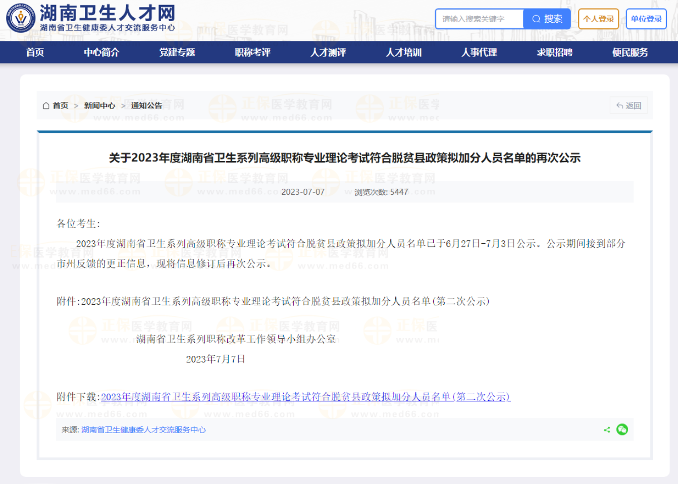 2023年度湖南省衛(wèi)生系列高級(jí)職稱專業(yè)理論考試符合脫貧縣政策擬加分人員名單已于6月27日-7月3日公示。公示期間接到部分市州反饋的更正信息,現(xiàn)將信息修訂后再次公示。
