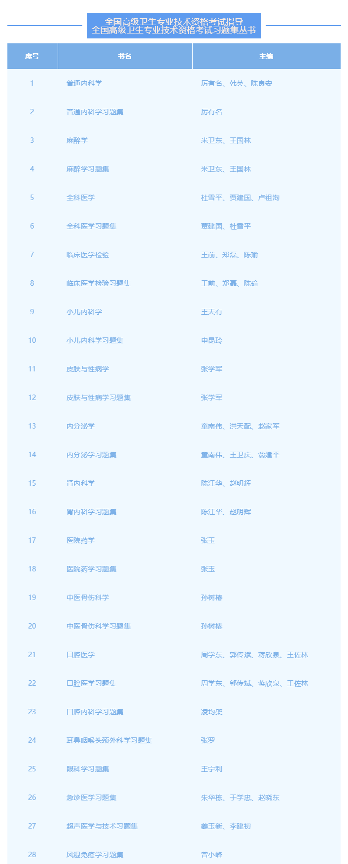 中國衛(wèi)生人才網(wǎng)發(fā)布全國高級衛(wèi)生專業(yè)技術(shù)資格考試用書新書推薦!各位考生速度看過來!醫(yī)學(xué)教育網(wǎng)整理具體內(nèi)容如下: