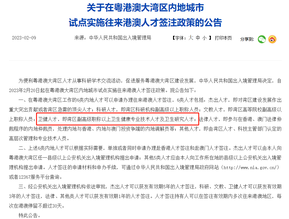 除此之外,2023年2月9日,國家移民管理局網(wǎng)站發(fā)布關(guān)于在粵港澳大灣區(qū)內(nèi)地城市試點(diǎn)實(shí)施往來港澳人才簽注政策的公告,公告提到自2023年2月20日起在粵港澳大灣區(qū)內(nèi)地城市試點(diǎn)實(shí)施往來港澳人才簽注政策。其中6類人才包括衛(wèi)健人才,需滿足副高級(jí)職稱以上人才。