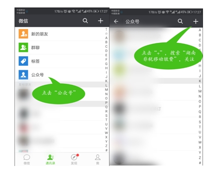 2.考生進入手機微信“通訊錄”菜單內“公眾號”頁面,點擊右上角“+”號,搜索“湖南非稅移動繳費”,關注公眾號。