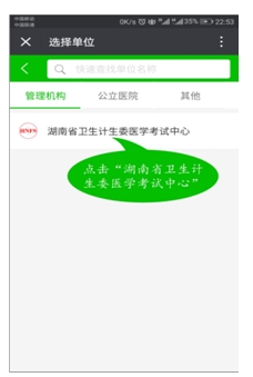 4.選擇“管理機構”下的“湖南省衛(wèi)生計生委醫(yī)學考試中心”;